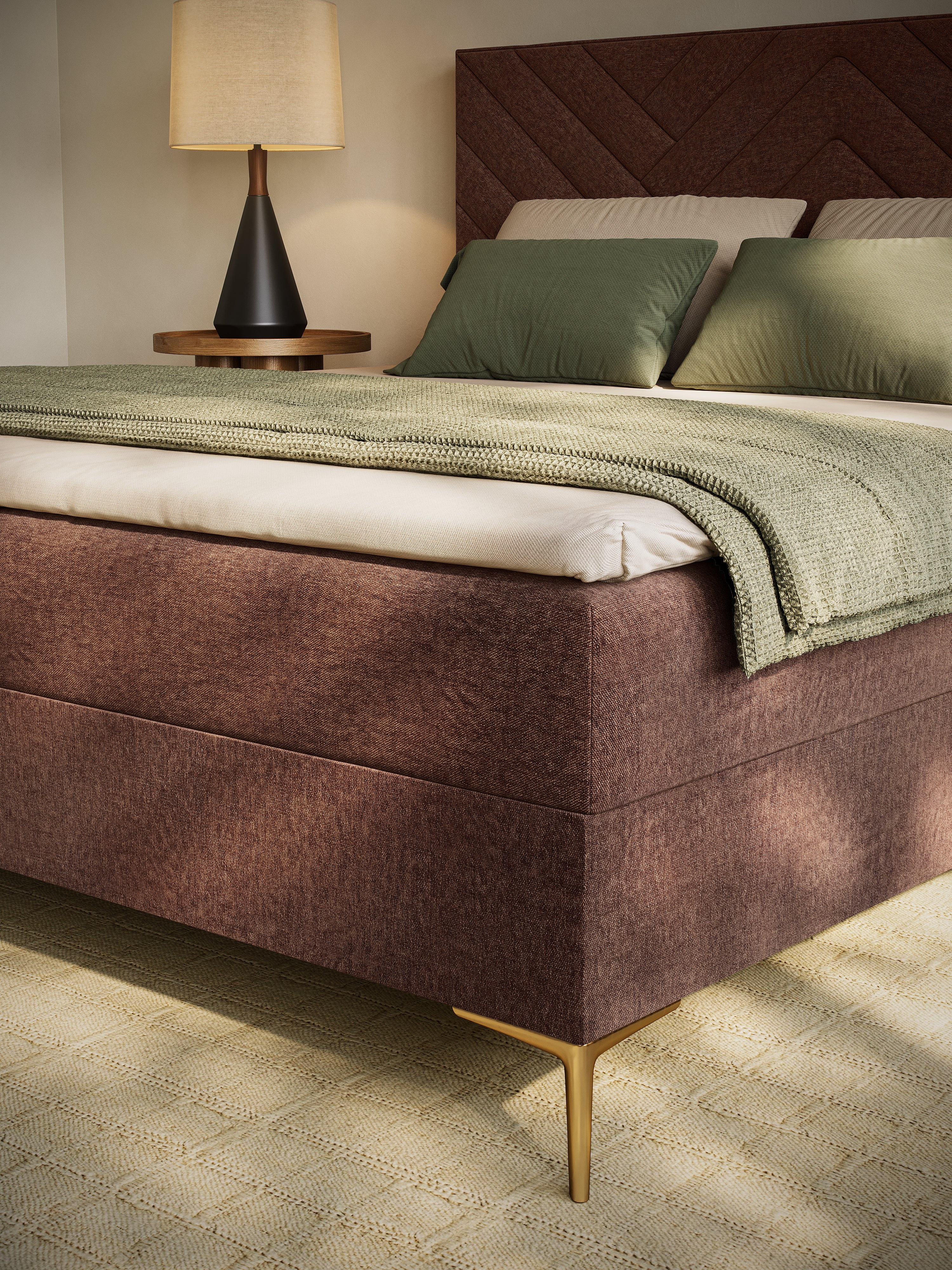 Stem het UrbanSleep N°1 bed af op jouw slaapkamerstijl. Kies de stof en kleur, het hoofdbord en de poten in jouw favoriete afwerking – zo past jouw nieuwe boxspring perfect in ieder interieur.